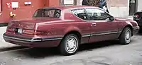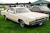The Mercury Marauder (second generation) was available for 1969 and 1970 as its own model line of personal luxury cars in base and X-100 trim.[49] The Marauder utilized Ford's redesigned XL hardtop's wheelbase that was 3-inch (76 mm) shorter than other full-sized Mercury models and included a 429 cu in (7.0 L) V8 engine.[50] It featured hidden headlamps, a flying buttress-style roofline with available matte-black rear and trunk lid finish, rear fender skirts as well as five-spoke aluminum wheels with white wall bias-ply tires.[51]