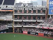 The Western Metal Supply Co. building, a hundred-year-old brick structure that had been scheduled for demolition to make way for Petco Park, was saved and incorporated into the design of the ballpark. The building was renovated and contains the team store, private suites, a restaurant and rooftop seating.[59] The southeast corner of the building serves as the left field foul pole, and is protected by a strip of bright yellow angle iron.