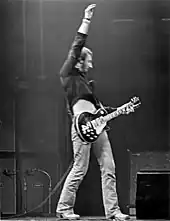 Townshend made several solo appearances during the 1970s, two of which were captured on record: Eric Clapton's Rainbow Concert[87] in January 1973 (which Townshend organized to revive Clapton's career after the latter's heroin addiction),[88] and the Paul McCartney-sponsored Concerts for the People of Kampuchea in December 1979. The commercially available video of the Kampuchea concert shows the two rock icons duelling and clowning[89] through Rockestra mega-band versions of "Lucille", "Let It Be", and "Rockestra Theme"; Townshend closes the proceedings with a characteristic split-legged leap.[90]