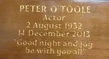O'Toole retired from acting in July 2012 owing to a recurrence of stomach cancer.[69] He died on 14 December 2013 at Wellington Hospital in St John's Wood, London, at the age of 81.[70] His funeral was held at Golders Green Crematorium in London on 21 December 2013, where his body was cremated in a wicker coffin.[71] His family stated their intention to fulfil his wishes and take his ashes to the west of Ireland.[72]