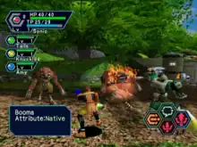After organizing a team, players are transported to their own instance of the hub spaceship Pioneer 2, where they can buy and sell items, store money and items, heal, and browse quests.[10] At any time, they can transport to Ragol, where combat and exploration take place.[10] The four environments – forests, caves, mines, or ruins[10] – comprise winding passages and large areas where enemies spawn.[10] Players fight enemies in real time, using weapons and techniques and collecting items.[13] Attacks can be chained for more accuracy and speed.[14][15] Typically, all the monsters in a room must be defeated to advance.[9] Each environment ends in a boss battle, which rewards the team with a large sum of experience points.[10] Quests, taken on Pioneer 2, task players with specific challenges; once completed, the team returns to Pioneer 2 to collect their reward.[10] Higher difficulties reward players with more experience points and better items. Some items can be used to feed the player's mag, a small creature that follows the player character and aids them in battle.[10]