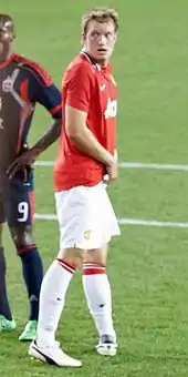 Jones made his competitive debut for United as a second-half substitute, replacing Rio Ferdinand in the 2011 FA Community Shield against rivals Manchester City. United were 2–0 behind, but won 3–2.[20] Jones made his league debut a week later, again as a substitute replacing Ferdinand, as United beat West Bromwich Albion 2–1 on the opening weekend.[21] On 10 September, Jones provided two assists for Wayne Rooney in United's 5–0 thumping of Bolton Wanderers at the Reebok Stadium.[22] Jones started the away match to Liverpool as a box-to-box midfielder, different from his usual centre-back and full-back positions he was accustomed to.[23] Jones scored his first ever senior goal on 3 December in a 1–0 away win against Aston Villa.[24] Jones scored a consolation goal against Basel in a 2–1 Champions League defeat that resulted in United being knocked out of the competition, heading in a loose ball after Federico Macheda's shot had come back off the bar.[25] On 21 December, he suffered a facial injury in an away match against Fulham, however the X-ray showed no serious damage and Jones returned to action in the 3–2 defeat against Blackburn on 31 December.
