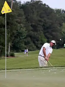 In 2008, Mickelson won the Crowne Plaza Invitational at Colonial with a −14, one shot ahead of Tim Clark and Rod Pampling. Mickelson shot a first-round 65 to start off the tournament at −5. He ended the day tied with Brett Wetterich, two shots behind leader, Johnson Wagner.[34] Mickelson shot a second-round 68, and the third round 65, overall, being −12 for the first three rounds.[35] On the final hole, after an absolutely horrendous tee shot, he was in thick rough with trees in his way. Many players would have punched out and taken their chances at making par from the fairway with a good wedge shot. Instead, Mickelson pulled out a high-lofted wedge and hit his approach shot over a tree, landing on the green where he one-putted for the win.[36]