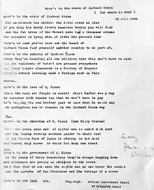 Ochs was having difficulties writing new songs during this period, but he had occasional breakthroughs. He updated his sarcastic song "Here's to the State of Mississippi" as "Here's to the State of Richard Nixon", with cutting lines such as "the speeches of the Spiro are the ravings of a clown", a reference to Nixon's vitriolic vice president, Spiro Agnew—sung as "the speeches of the President are the ravings of a clown" after Agnew's resignation.[101][102][103]
