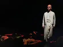 In spring 1978, Glass received a commission from the Netherlands Opera (as well as a Rockefeller Foundation grant) which "marked the end of his need to earn money from non-musical employment".[47] With the commission Glass continued his work in music theater, composing his opera Satyagraha (composed in 1978–1979, premiered in 1980 at Rotterdam), based on the early life of Mahatma Gandhi in South Africa, Leo Tolstoy, Rabindranath Tagore, and Martin Luther King Jr. For Satyagraha, Glass worked in close collaboration with two "SoHo friends": the writer Constance deJong, who provided the libretto, and the set designer Robert Israel. This piece was in other ways a turning point for Glass, as it was his first work since 1963 scored for symphony orchestra, even if the most prominent parts were still reserved for solo voices and chorus. Shortly after completing the score in August 1979, Glass met the conductor Dennis Russell Davies, whom he helped prepare for performances in Germany (using a piano-four-hands version of the score); together they started to plan another opera, to be premiered at the Stuttgart State Opera.[30]