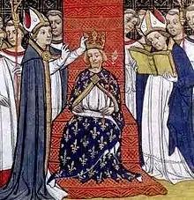 Philip III arrived in Paris on 21 May 1271, and paid tribute to the deceased.[21] The next day the funeral of his father was held.[22] The new sovereign was crowned king of France in Reims on 15 August 1271.[23]
