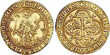 The defeat at the battle of Golden Spurs in 1302 was a crushing blow to French finance: the 15 months which followed this battle saw a depreciation of the currency by 37%, and new decrees were issued forbidding the export of gold and silver abroad.[31] The royal government had to order officials and subjects to provide all or half, respectively, of their silver vessels for minting into coins.[31] New taxes were levied to pay for the deficit.[31][32] As people attempted to move their wealth out of the country in non-monetary form, Philip banned merchandise exports without royal approval.[31] The king obtained another crusade tithe from the pope and returned the royal treasure to the Temple to gain the Templars as his creditors again.[31]