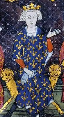 Philip married Queen Joan I of Navarre (1271–1305) on 16 August 1284.[9] The two were affectionate and devoted to each other and Philip refused to remarry after Joan's death in 1305, despite the great political and financial rewards of doing so.[10] The primary administrative benefit of the marriage was Joan's inheritance of Champagne and Brie, which were adjacent to the royal demesne in Ile-de-France, and thus effectively were united to the king's own lands, expanding his realm.[11] The annexation of wealthy Champagne increased the royal revenues considerably, removed the autonomy of a large semi-independent fief and expanded royal territory eastward.[11] Philip also gained Lyon for France in 1312.[12]