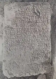 - Escaped to Cilicia: An inscription of Philip II was found in Olba, the capital of a Cilician priestly principality.[58] Historian Auguste Bouché-Leclercq concluded that Philip I could not have returned to the capital following his defeat in Damascus because the populace became weary of the endless Seleucid dynastic quarrels. Bouché-Leclercq conjectured, based on the inscription of his son, that Philip I might have escaped to Cilicia and died in the chaos caused by the Second Mithridatic War (83–81 BC) between Mithridates VI of Pontus and Rome. Another possibility is that Philip I was preparing to take back his throne after the death of Antiochus XII (d. 82 BC), but was caught off guard by the arrival of Tigranes II and put to death in Cilicia.[59] Historian Theodora Stillwell MacKay suggested that Philip I fled to Olba following his confrontation with Antiochus XII.[58] The epigraphers Josef Keil and Adolf Wilhelm suggested that Philip I stayed with the priest-prince of the city.[60]