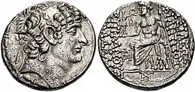 Philip I and Antiochus XI probably resided in Cilicia during Seleucus VI's reign.[21] In 94 BC, shortly after their brother's death, Philip I and Antiochus XI minted jugate coins with their portraits on the obverse.[11] The historian Alfred Bellinger suggested that their base of operations was a coastal city north of Antioch,[22] but according to the numismatist Arthur Houghton, Beroea is a stronger candidate because the city's rulers were Philip I's allies.[23] All the jugate coins were minted in Cilicia; the series with the most numerous surviving specimens was probably issued in Tarsus, making it the likely base of operations.[24] Antiochus XI was portrayed in front of his brother, indicating that he was the senior king.[note 2][25] Deriving their legitimacy from Antiochus VIII, the brothers were depicted on the coins with exaggerated aquiline noses similar to their father.[26] Hellenistic kings did not use regnal numbers, which is a modern practise; instead, they used epithets to distinguish themselves from similarly named monarchs.[27][28] On his coins, Philip I used the epithets Philadelphus (sibling-loving) and Epiphanes (the glorious, or illustrious).[29] The brothers intended to avenge Seleucus VI;[note 3][11] according to the fourth century writer Eusebius, they sacked Mopsuestia and destroyed it.[note 4][10]