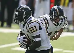In August 2004, Rivers signed a six-year, $40.5 million contract with the San Diego Chargers that included $14.5 million in signing bonuses.[40] However, due to a protracted contract negotiation with the San Diego Chargers, Rivers only reported to the team during the last week of training camp, and incumbent Drew Brees retained his starting job. Rivers began the season as the Chargers' third quarterback option, behind Doug Flutie,[41] and ahead of the fourth quarterback on the depth chart, Cleo Lemon. Unfortunately for Rivers, Brees went on to have a then-career year and was named to the NFL Pro Bowl while winning the NFL Comeback Player of the Year Award.[42] Rivers received very limited playing time, playing in only two games. He only threw passes in the second half of the last game of the 2004 season, a victory over the Kansas City Chiefs, by which time the Chargers had already clinched a home playoff spot and the AFC West division title. In the victory, he threw his first touchdown pass to fellow rookie Malcom Floyd.[43] He was not on the active roster for San Diego's Wild Card Round playoff loss to the New York Jets.[44]