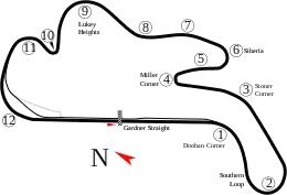 A new 3.312 mi (5.330 km) triangular circuit utilising the pit straight from the original rectangular course was subsequently mapped out and first used for the Australian Race Drivers' Cup on 5 November 1935.[4] The final car event on the circuit was held on Cup Day (1 November) 1938[5] and the final motorcycle race meeting was conducted on 30 January 1940.[6]