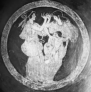 According to Ovid, in the fifth year of Procne's marriage to Tereus, King of Thrace and son of Ares, she asked her husband to "Let me at Athens my dear sister see / Or let her come to Thrace, and visit me."[7] Tereus agreed to travel to Athens and escort her sister, Philomela, to Thrace.[7] King Pandion of Athens, the father of Philomela and Procne, was apprehensive about letting his one remaining daughter leave his home and protection and asks Tereus to protect her as if he were her father.[7][12] Tereus agrees. However, Tereus lusted for Philomela when he first saw her, and that lust grew during the course of the return voyage to Thrace.[7]