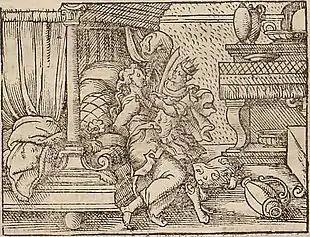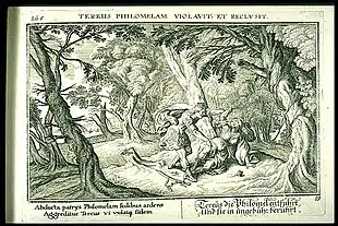 Arriving in Thrace, he forced her to a cabin or lodge in the woods and raped her.[7] After the assault, Tereus threatened her and advised her to keep silent.[7] Philomela was defiant and angered Tereus. In his rage, he cut out her tongue and abandoned her in the cabin.[7] In Ovid's Metamorphoses Philomela's defiant speech is rendered (in an 18th-century English translation) as: