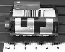 In the 1980s, Kodak developed DX Encoding (from Digital indeX), or DX coding, a feature that was eventually adapted by all camera and film manufacturers.[35] DX encoding provides information on both the film cassette and on the film regarding the type of film, number of exposures, speed (ISO/ASA rating) of the film. It consists of three types of identification. First is a barcode near the film opening of the cassette, identifying the manufacturer, film type and processing method (see image below left). This is used by photofinishing equipment during film processing. The second part is a barcode on the edge of the film (see image below right), used also during processing, which indicates the image film type, manufacturer, frame number and synchronizes the position of the frame. The third part of DX coding, known as the DX Camera Auto Sensing (CAS) code, consists of a series of 12 metal contacts on the film cassette, which beginning with cameras manufactured after 1985 could detect the type of film, number of exposures and ISO of the film, and use that information to automatically adjust the camera settings for the speed of the film.[35][36][37]