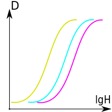 Over the active dynamic range of most films, the density of the developed film is proportional to the logarithm of the total amount of light to which the film was exposed, so the transmission coefficient of the developed film is proportional to a power of the reciprocal of the brightness of the original exposure. The plot of the density of the film image against the log of the exposure is known as an H&D curve.[9] This effect is due to the statistics of grain activation: as the film becomes progressively more exposed, each incident photon is less likely to impact a still-unexposed grain, yielding the logarithmic behavior. A simple, idealized statistical model yields the equation density = 1 – ( 1 – k) light, where light is proportional to the number of photons hitting a unit area of film, k is the probability of a single photon striking a grain (based on the size of the grains and how closely spaced they are), and density is the proportion of grains that have been hit by at least one photon. The relationship between density and log exposure is linear for photographic films except at the extreme ranges of maximum exposure (D-max) and minimum exposure (D-min) on an H&D curve, so the curve is characteristically S-shaped (as opposed to digital camera sensors which have a linear response through the effective exposure range).[10] The sensitivity (i.e., the ISO speed) of a film can be affected by changing the length or temperature of development, which would move the H&D curve to the left or right (see figure).[11][12]