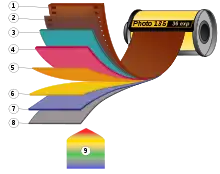 Many films contain a top supercoat layer to protect the emulsion layers from damage.[24] Some manufacturers manufacture their films with daylight, tungsten (named after the tungsten filament of incandescent and halogen lamps) or fluorescent lighting in mind, recommending the use of lens filters, light meters and test shots in some situations to maintain color balance, or by recommending the division of the ISO value of the film by the distance of the subject from the camera to get an appropriate f-number value to be set in the lens.[25][26]