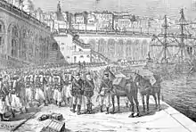 The number of Pieds-Noirs who fled Algeria totalled more than 800,000 between 1962 and 1964.[48] Many Pieds-Noirs left only with what they could carry in a suitcase.[6][48] Adding to the confusion, the de Gaulle government ordered the French Navy not to help with transportation of French citizens.[36] By September 1962, cities such as Oran, Bône, and Sidi Bel Abbès were half-empty. All administration-, police-, school-, justice-, and commercial activities stopped within three months after many Pieds-Noirs were told to choose either "la valise ou le cercueil" (the suitcase or the coffin).[43] 200,000 Pieds-Noirs chose to remain, but they gradually left through the following decades; by the 1980s only a few thousand Pieds-Noirs remained in Algeria.[7][35]