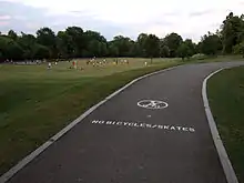 The park hosts several miles of paved paths suitable for walking, running, biking, and inline skating. Skate Escape across from the park at the 12th Street entrance rents both bikes and skates.[39] On weekend afternoons, skateboarders and inline skaters often share the open, paved area inside the 12th Street entrance.[40]