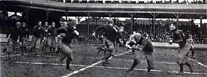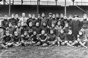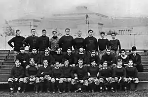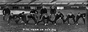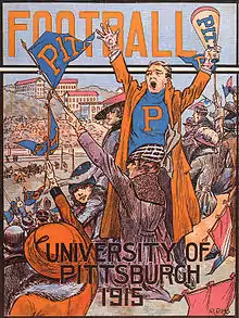 In 1914, Pitt athletic booster Joseph Trees and athletic director A. R. Hamilton hired Pop Warner as Pitt's head coach. Warner, who had previously led Carlisle, Cornell, and Georgia, had been successful at his previous stops, mentoring the likes of Jim Thorpe, and was known as an innovator of the game who originated the screen pass, single- and double-wing formations, and use of shoulder and thigh pads. His arrival at Pitt gave the program instant national credibility, lifting the perception of the program from a regional power to that of a national one.[29] Warner's impact was immediate. Led by center Robert Peck, Pitt's first First Team All-American, and All-American end James Pat Herron, Warner's first Pitt team in 1915 went 8–0, shutting out five opponents, and was trumpeted by football historian Parke H. Davis as that season's national champion.[30] His second season duplicated that success, repeating an 8–0 record while collectively outscoring opponents 255–25, and garnering what is widely regarded as a consensus national championship.[31] The lone scare of the 1916 season occurred at Navy when, following a delay of the team's train heading to Annapolis that caused a late arrival, the team overcame several fumbles and eked out a 20–19 victory.[32] The 1916 team was led again by Herron and Peck, now in his last season, as well as All-Americans fullback Andy Hastings and guard "Tiny" Thornhill. Also on that team were Jock Sutherland and H.C. "Doc" Carlson, who both would garner First Team All-American selections while members of the undefeated 1917 team, and go on to become perhaps Pitt's most legendary coaches in football and basketball, respectively. The 1917 team, nicknamed "The Fighting Dentists" because over half the roster became doctors or dentists, finished 10–0 with five shutouts despite losing several players to military service at the outbreak of World War I. The Spanish flu pandemic of 1918, which took the life of former Pitt star Tex Richards,[33] saw the implementation of quarantines that eliminated much of that year's college football season, including five of Pitt's originally scheduled contests. All of Pitt's games that year were played in November, including a high-profile game played as a War Charities benefit against undefeated, unscored upon, and defending national champion Georgia Tech, coached by the legendary John Heisman. Pitt swept through its first two games and then dismantled Georgia Tech 32–0 in front of many of the nation's top sports writers including Walter Camp. The final game of the season at Cleveland Naval Reserve resulted in Warner's first loss at Pitt and is one of the most controversial in school history. Warner, along with some reporters covering the game, insisted Pitt was robbed by the officials who, claiming the official timekeeper's watch was broken, arbitrarily ended the first half before Pitt was able to score and then allowed the Reserves extra time in the fourth quarter to pull ahead 10–9 before calling an end to the game.[34][35] Despite the loss, the 4–1 Panthers of 1918 were named by multiple selectors as a national champion for that season.[36]