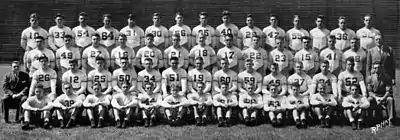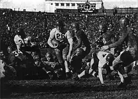 The 1930 season, at 6–2–1, was a rebuilding one for Sutherland, and was marked by a loss to Notre Dame that would be the only meeting between Sutherland and Knute Rockne due to his death in a 1931 plane crash. The Irish also spoiled Pitt's perfect season in a 1931 game at South Bend, although the Panthers finished 8–1 with six shutouts, including a 40–0 dismantling of Nebraska. That season also saw Pitt defeat Penn State in State College, using only one first-string player, by a score of 41–6 en route to winning the Eastern Championship.[41] These accomplishments would prompt Parke Davis to again name the Panthers national champions.[30] Pitt would exact revenge at home the following season by shutting out Notre Dame 12–0, and would also upend undefeated Penn in Philadelphia, as well as shut out Stanford at home on their way to the 1932 Eastern Championship. However, the season ended when the Panthers, in their third Rose Bowl, were again defeated by USC. The 1933 season was spoiled only by a 7–3 loss at Minnesota in which the Panthers fumbled twice inside their own 5-yard line. Minnesota would best Pitt again in 1934, when the Panthers squandered a third quarter lead to lose 13–7 to the undefeated Gophers.[42] However, in 1934 Pitt also won at Nebraska 25–6, shut out Notre Dame 19–0, its third victory in a row over the Irish, and got revenge for the previous Rose Bowl losses to USC by defeating the Trojans 20–6 at Pitt Stadium. With these victories Pitt was named Eastern Champions as well as being awarded a share of the national championship by Parke Davis.[4][43][44] Pitt underwent rebuilding in 1935, going 7–1–2. Of historic note, in 1935, Pitt battled then football powerhouse Fordham, who featured the Seven Blocks of Granite which included guard Vince Lombardi, to the first of what would be three consecutive scoreless ties at New York City's Polo Grounds. Pitt ended the season with a 12–7 win at USC.