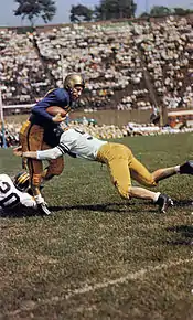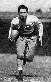 During this period, Pitt regularly dominated opposing teams, even inducing Notre Dame to drop Pitt from its schedule.[50] However, it was also during this era that the university, led by chancellor John Gabbert Bowman, began introducing policies designed to de-emphasize the athletic programs. This was manifested when a plan was instituted in the spring of 1937 by Athletic Director James "Whitey" Hagan, who had actually played for Sutherland, to eliminate university subsidies for athletes.[51] Hagan's plan was then absorbed into a 1938 athletics code of conduct, referred to as "Code Bowman", which discouraged alumni help, restricted practices to two hours a day, and eliminated both athletic recruiting and all direct subsidization of athletics.[52][53] While the implementation of these policies was the beginning of the end for that era of Pitt football prominence, the Panthers still impressed during the 1938 season behind an assembly of talent at running back labeled the "Dream Backfield." With Goldberg at fullback, Dick Cassiano and Harold Stebbins at halfback, and John Chickerneo at quarterback, Pitt won at Wisconsin, shut out West Virginia and Penn State at home and Nebraska on the road, and routed Southern Methodist. Notably, the deadlock against Fordham was finally broken as Pitt defeated the Rams 24–13 at Pitt Stadium.[54] However, Pitt was tripped up against neighboring rival Carnegie Tech and at undefeated Duke. Following the season, the split between the administration and Sutherland became complete, and Sutherland resigned in March saying "The present system of athletic administration has resulted in conditions which, for me, are intolerable." The resignation caused a firestorm in the press and among the program's supporters, and resulted in student outrage and protests. However, the athletic code was firmly implemented and Sutherland's resignation stood.[55][56]