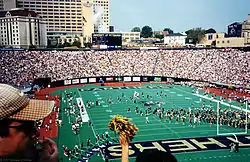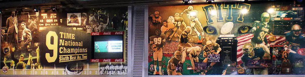 The Pitt football program saw many changes instituted in 1997. New athletic director Steve Pederson moved to revamp the athletic department after the preceding years had wounded the program's image.[84] A controversial emphasis on the use of the full name "Pittsburgh", at the expense of the university's abbreviated moniker "Pitt", along with new logos designed to invoke the heritage of the steel industry in the region, were instituted in an attempt to tie the school more closely to the image of the city. New shades of blue and gold were introduced and the athletic booster club was overhauled.[85] Walt Harris, who had built a reputation as a quarterback guru with a background in the West Coast Offense, was brought in to replace Majors in 1997 and undertook the task of rebuilding a program that won only fifteen games in the previous five seasons. Results were almost immediate as Harris took Pitt to the 1997 Liberty Bowl in his first season, finishing with a 6–6 record. Over the next two seasons, the Panthers posted a losing record as Harris worked on enhancing the talent in Pitt's program. At the same time, the university administration decided to bring the football program's deteriorating facilities in line with those of Pitt's peers. A state-of-the art practice facility, the UPMC Sports Performance Complex, was constructed on the city's South Side in collaboration with the University of Pittsburgh Medical Center. In lieu of much-needed but cost-prohibitive renovations to modernize Pitt Stadium, the administration made a controversial decision to move home games to the newly proposed North Shore stadium, later named Heinz Field, and to demolish Pitt Stadium in order to build a long-awaited convocation center on its footprint.[86] 1999 was the final season for the Panthers in Pitt Stadium, which had served Pitt for 75 seasons. On November 13, 1999, the Panthers upset Notre Dame 37–27 in the last game played at the stadium. Although the Panthers showed improvement during the 1999 season, their loss in the season finale at West Virginia left them with a 5–6 record and without a bowl.