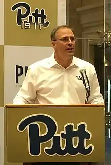 Pittsburgh slipped to a 5–7 record in 2017.[143] The Panthers kicked off the season on September 2, defeating FCS Youngstown State in overtime by a score of 28–21.[144] One week later, Pitt lost the Keystone Classic to archrival No. 4 Penn State by a margin of 33–14.[145] In the season's third game, Narduzzi's squad lost its second straight contest with a 59–21 defeat at the hands of No. 9 Oklahoma State.[146] After a 42–10 victory over Rice,[147] the Panthers lost another two straight; falling to Syracuse by a margin of 27–24[148] and No. 20 NC State by a score of 35–17.[149] Pitt then won their next two; defeating Duke by a margin of 24–17[150] and Virginia by a score of 31–14.[151] After a 34–31 loss to North Carolina[152] and a 20–14 defeat to No. 17 Virginia Tech[153] knocked the Panthers out of bowl contention, Narduzzi's team finished the season with a big upset victory, stunning No. 2 Miami by a score of 24–14.[154] On December 6, 2017, the University of Pittsburgh administration signed Narduzzi to another contract extension and raise, extending his deal by seven years.[155] Narduzzi led Pitt to its first ACC Coastal Division Championship in 2018.[156]