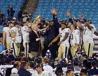 The 1976 season began with the Panthers ranked ninth in the AP preseason poll. The first game was at Notre Dame, where the Irish grew the grass long on the playing field in a failed attempt to slow down Dorsett, who had burned them for 303 rushing yards the year before.[70] Their efforts were in vain as Dorsett ran for a 61-yard gain on Pitt's first play from scrimmage on the way to a 31–10 win. The season continued with a 42–14 win at Georgia Tech and a 36–19 win over Miami. On October 23, the Panthers travelled to Annapolis to face Navy during which Dorsett broke the NCAA career rushing record on a 32-yard touchdown run in Pitt's 45–0 victory. Dorsett's achievement prompted a mid-game celebration in which even Navy saluted the feat with a cannon blast.[71] Pitt next defeated eastern rival Syracuse 23–13, and on November 6, number two ranked Pitt easily handled Army while number one ranked Michigan lost to Purdue. For the first time since 1939, the Pitt Panthers were the number one ranked team in the country. The following week, they successfully defended their top rating in a close Backyard Brawl against rival West Virginia. With a record of 10–0, the Panthers headed into their regular season finale with only heated instate rival Penn State standing in the way of Pitt's national title aspirations. At a packed Three Rivers Stadium on the day after Thanksgiving, the Nittany Lions held Dorsett to 51 yards in the first half and had the game tied 7–7. Majors adjusted for the second half by shifting Dorsett from tailback to fullback, enabling him to explode for an additional 173 yards as Pitt rolled to a 24–7 victory that capped an undefeated regular season.[72] In December, Dorsett became the first Pitt Panther to win the Heisman Trophy as the nation's best college football player. Dorsett also won the Maxwell Award, the Walter Camp Player of the Year Award, and was named UPI Player of the Year. The 11–0 Panthers accepted an invitation to the 1977 Sugar Bowl to face fourth ranked Georgia. Pitt defeated the Bulldogs 27–3 and was voted number one in both the final Associated Press and Coaches polls, claiming their ninth national championship.[73] This was Pitt's first undefeated national championship since 1937. The American Football Coaches Association (AFCA) named Majors the 1976 Coach of the Year. Following this historic season, Majors returned to his alma mater, the University of Tennessee, to take the head coaching job.[74]