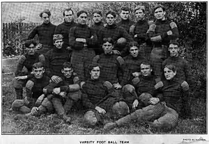 Football at the University of Pittsburgh began in the fall of 1889 when the school was still known as the Western University of Pennsylvania, often referred to as WUP, and was located in what was then known as Allegheny City and is today the city of Pittsburgh's North Side. A 130-pound WUP student, Bert Smyers, along with senior student John Scott, assembled a football team that year composed of only three players who had previously witnessed the sport. The team played in one informal game, a loss against Shady Side Academy, in which Smyers made himself quarterback and Scott played center. In preparation for the following year, the first season of football officially recognized by the university, Smyers and his teammates took up a collection and purchased a football for practices and games; players were responsible for their own uniforms. In Smyers' case, his uniform was pieced together by his mother and sister.[9] The first official game for the university was played on October 11, 1890, when the Allegheny Athletic Association's opponent, Shadyside Academy, failed to appear for its game at Exposition Park. Allegheny A.A. called Smyers who brought the WUP team as a replacement. In an inglorious start to Pitt football history, WUP was defeated 38–0.[10] Smyers' team next faced Washington and Jefferson College, losing 32–0, but closed out its inaugural three game season with the university's first win, a 10–4 victory over Geneva College.[11] The following season saw the university collect more losses en route to a 2–5 record. Smyers suffered a broken nose in a 40–6 loss to Washington and Jefferson, a school that would become one of WUP's fiercest early rivals. The WUP team did record the school's first shutout with a 6–0 win over Geneva, as well as the school's first blowout in a 54–0 win over Western Pennsylvania Medical College who became affiliated with WUP in 1892 and later became the university's medical school when they merged in 1908.[11][12] Perhaps the most important development for the second season of football was Smyers recruitment of Joseph Trees from Normal University of Pennsylvania. The 210 pound Trees became WUP's first subsidized athlete[13] and, later in life, made millions in the oil industry and became an important benefactor for the university and athletic department. Today, Trees Hall, an athletic facility on the University of Pittsburgh's main campus in the Oakland section of Pittsburgh, bears his name. The first winning record for the university came in the third season of competition in 1892, when the team posted a 4–2 record. The following season in 1893, the team had its first official coach, Anson F. Harrold, who led the team to an unremarkable 1–4 record. However, during that season the first contest was played in what would become a 100-game series versus Penn State, thus originating one of the longest and fiercest rivalries for both schools. In 1895, the school suffered a 1–6 season under coach J.P. Linn. The 1895 season was notable for the first Backyard Brawl on October 26, 1895, with WUP losing to West Virginia 8–0 in Wheeling, West Virginia. The university did not see another winning season until Fred Robinson led WUP to a 5–2–1 record in 1898. In 1899, Robinson continued his success with a 3–1–1 record, giving the school its first back-to-back winning seasons. This was followed by two more consecutive winning seasons, including a record seven-win season in 1901 under coach Wilbur Hockensmith. That season, Hockensmith led the school to its first victory over West Virginia, a 12–0 shutout in Morgantown on October 5, 1901.
