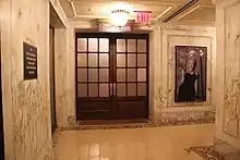 The 58th Street entrance has three elevators and adjoins what was formerly a women's reception room.[41][62] West of this lobby is a staircase leading up to a mezzanine-level corridor,[63][64] which has marble floors and ashlar walls and abuts the Terrace Room's balcony to the north and a foyer to the south. The mezzanine-level foyer has marble floors, a painted coffered ceiling supported by two square columns, and a bank of two elevators to the ballroom on floor 1. A marble staircase, with a marble and wooden balustrade, leads from the mezzanine foyer to the ballroom level.[65]