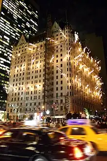 The detail of the facade is concentrated on its two primary elevations, which face north toward Central Park and east toward Fifth Avenue. The facade's articulation consists of three horizontal sections similar to the components of a column, namely a base, shaft, and crown. The northern and eastern elevations are also split vertically into three portions, with the center portion being recessed. The northeastern and southeastern corners of the hotel contain rounded corners, which resemble turrets. There are numerous loggias, balustrades, columns, pilasters, balconies, and arches repeated across various parts of the facade.[5][9][26] The 1921 annex contains a design that is largely similar to Hardenbergh's 1907 design.[27]