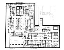 The original double-height ballroom from Hardenbergh's plan was on the north side of the second story, or floor 1 according to the Plaza Hotel's floor numbering system. The old ballroom, with a capacity of 500 to 600 people, was served by its own elevator and staircase, and contained a movable stage.[29][62] The old ballroom was overlooked on three sides by balconies, and contained a white-and-cream color scheme similar to the current ballroom.[35][51] It was served by its own entrance on 58th Street.[51] By the 1970s, the old ballroom was replaced by offices.[31]