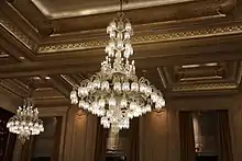 In 1929, Warren and Wetmore's ballroom was reconstructed according to a neoclassical design by Schultze & Weaver.[31][100] The room has a white-and-cream color scheme with gold ornamentation, evocative of the original ballroom's design.[49][101] The stage remains on the western wall, but is within a rounded opening. The redesign added audience boxes, with decorative metal railings, on the north and east walls.[102][103] The ballroom contains a coved ceiling with roundels, lunettes, bas reliefs, and two chandeliers.[102] South of the ballroom proper is a corridor running west to east.[99][64] The corridor has a decorative barrel-vaulted paneled ceiling and had a balcony that was removed during the 1929 redesign.[104] On the southernmost section of floor 1 is the ballroom foyer and the stair hall, two formerly separate rooms that were combined in 1965 to form a neoclassical marble-clad space. The stair hall contains the stairs leading from the mezzanine foyer.[105][106]