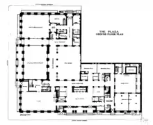 The hotel has a steel frame superstructure with hollow tile floors, as well as wired-glass enclosures around all stairways and elevators.[29] Originally, five marble staircases led from the ground floor to all of the other floors.[41][42] As constructed, the stories above the ground floor surrounded a large courtyard,[35] which was covered over with office space in a 1940s renovation.[31][43][44] Hardenbergh, in designing the Central Park South foyer, had believed the lobby to be the most important space in the hotel,[45][46] as did Warren and Wetmore when they designed the Fifth Avenue lobby.[47][48] Furthermore, Warren and Wetmore had thought restaurants to be the second most significant space in a hotel, in designing the Terrace Room.[47][49]