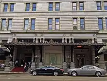 The first and second stories of the facade, respectively corresponding to the ground floor and floor 1 of the interior,[lower-alpha 2] are clad with rusticated blocks of marble. The third story, corresponding to floor 2 of the interior, contains a smooth marble surface.[28] The hotel had two guest entrances in the 1907 design: the main entrance on Central Park South and a private entrance for long-term residents on 58th Street.[29][30] The main entrance, in the center of the Central Park South facade, contains a porch above the three center bays, and large doorways.[30][31] Since the hotel's 2008 renovation, the Central Park South entrance has served as the entrance to the building's condominiums.[32]