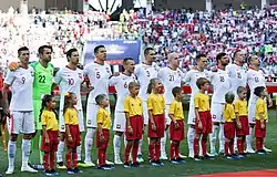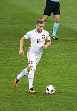 Poland's first match was with Northern Ireland on 12 June at the Stade de Nice in Nice; they won the game 1–0 with a goal from Arkadiusz Milik in the 51st minute.[144] The next match was with Germany at the Stade de France in Saint-Denis on 16 June; with the finishing 0–0.[145] Poland's final group game was with Ukraine on 21 June, at the Stade Vélodrome in Marseille, a game they won 1–0 with a goal from Jakub Błaszczykowski.[146] In the round of sixteen, Poland were drawn to play Switzerland on 25 June at the Stade Geoffroy-Guichard in Saint-Étienne. Poland took the lead through a goal from Błaszczykowski, but conceded a bicycle kick from Xherdan Shaqiri in the 82nd minute, finishing the game 1–1 in regular time. Poland then beat Switzerland in a penalty shootout, 5–4.[147][148] Poland then faced Portugal in the quarter-finals; another penalty shootout occurred after a 1–1 draw. Poland lost the shootout 5–3.[149]