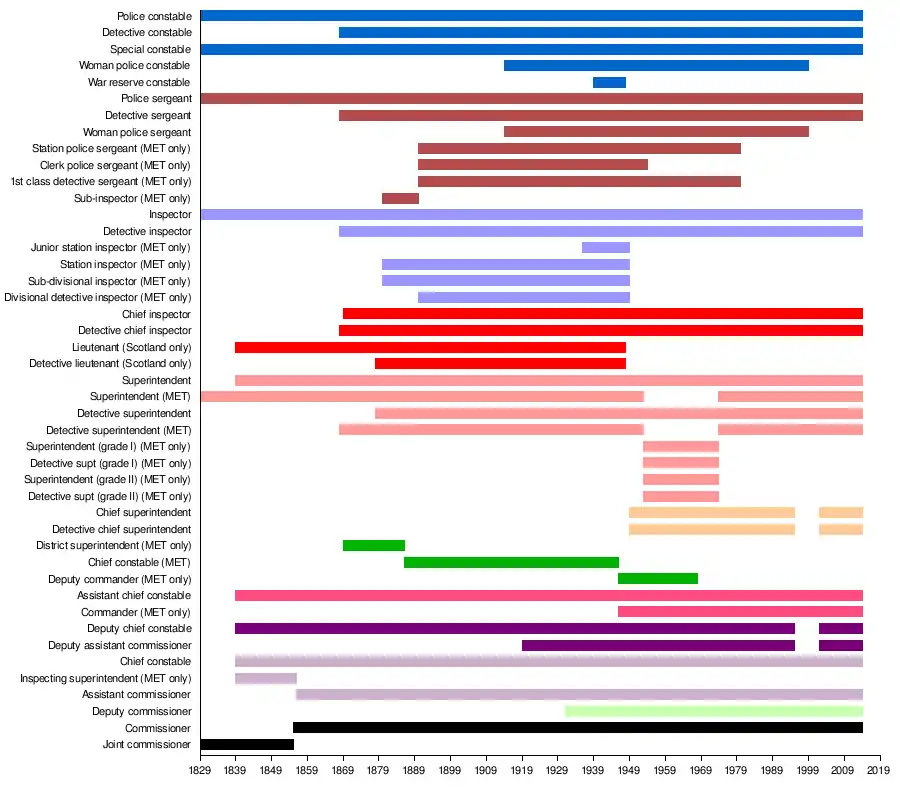 All police forces have used a wide variety of ranks to meet their organisational needs, especially the Metropolitan Police Service.[10] Ranks have been created, abolished, amalgamated and sometimes revived during the history of British policing.[11][12][13][14]