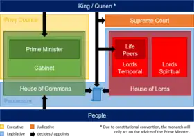 The British Parliament is the supreme legislative body in the United Kingdom (i.e., there is parliamentary sovereignty), and government is drawn from and answerable to it. Parliament is bicameral, consisting of the House of Commons and the House of Lords. There are also devolved Scottish and Welsh parliaments and a devolved assembly in Northern Ireland, with varying degrees of legislative authority.