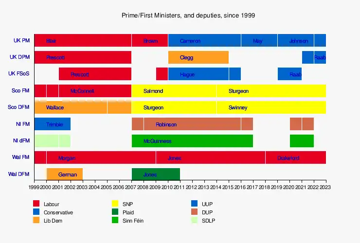 The Welsh Government and Senedd have more limited powers than those devolved to Scotland,[9] although following the passing of the Government of Wales Act 2006 and the 2011 Welsh devolution referendum, the Senedd can now legislate in some areas through an Act of Senedd Cymru. The current First Minister of Wales, or Prif Weinidog Cymru in Welsh, is Mark Drakeford of Welsh Labour.
