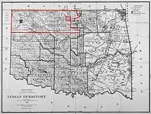 Ponca City was created in 1893 as "New Ponca" after the United States opened the Cherokee Outlet for European-American settlement during the Cherokee Strip land run, the largest land run in United States history.[1] The site for Ponca City was selected for its proximity to the Arkansas River and the presence of a freshwater spring near the river. The city was laid out by Burton Barnes, who drew up the first survey of the city and sold certificates for the lots he had surveyed. After the drawing for lots in the city was completed, Barnes was elected the city's first mayor.[8]