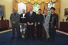 The band took a considerably more conservative, stripped down approach with Pop's follow-up, All That You Can't Leave Behind (2000), along with the Elevation Tour that supported it; All That You Can't Leave Behind features a "more traditional U2 sound."[58] The few songs from Pop that were performed on the Elevation Tour ("Discothèque", "Gone", "Please", "Staring at the Sun", and "Wake Up Dead Man") were often presented in relatively bare-bones versions. On the Vertigo Tour, songs from Pop were even more rarely played; "Discothèque" was played twice at the beginning of the third leg, while other Pop songs appeared merely as snippets. No Pop songs appeared on the band's U2 360° Tour, though the chorus and guitar riff of "Discotheque" did appear as a regular snippet during the "dance" remix of the song "I'll Go Crazy If I Don't Go Crazy Tonight" late in the tour. U2 did not play a single song from the album on their Innocence + Experience Tour in 2015, although "Mofo" was sampled twice in the earliest tour dates. Pop was the only U2 album that U2 did not play a single song from for the full duration of their tour. Pop was viewed as U2's "most neglected album" with the band "effectively [disowning] the record by purging its material from setlists."[50][59] Although he reiterated his belief that the album was rushed, the Edge still viewed Pop as a "great record," and said, "I was very proud of it by the end of the tour. We finally figured it out by the time we made the DVD. It was an amazing show that I'm really proud of." In the same interview, Edge also states, "We started out trying to make a dance-culture record and then realized at the end there are things we can do that no EDM producer or artist can do, so let’s try and have it both ways. In that case, we probably went too far in the other direction. We probably needed to allow a bit more of the electronica to survive."[60]