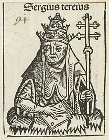 Sergius was the son of Benedictus,[10] and traditionally was believed descended from a noble Roman family, although it has been speculated that he was in fact related to the family of Theophylact I of Tusculum. He was ordained as a subdeacon by Pope Marinus I, followed by his being raised to the diaconate by Pope Stephen V.[11] During the pontificate of Pope Formosus (891–896), he was a member of the party of nobles who supported the Emperor Lambert, who was the opponent of Formosus and the pope's preferred imperial candidate, Arnulf of Carinthia.[12] Formosus consecrated Sergius as Bishop of Caere (Cerveteri) in 893, apparently in order to remove him from Rome.[13] Sergius ceased to act as Bishop of Caere with the death of Formosus in 896, as all of the ordinations conferred by Formosus were declared null and void,[14] although Formosus' ordination of Sergius was later reconfirmed by Theodore II.[15] He also actively participated in the farcical Cadaver synod that condemned the pontificate of Formosus.[16]