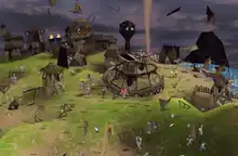 Whereas previous Populous games were god games where players assumed the role of a god with terrain-altering abilities, Populous: The Beginning adopts elements of real-time strategy games. Rather than being a god, the player controls a Shaman trying to become one, and directly controls the actions of followers, by ordering them to build structures or attack enemies.[5][6][7] In the campaign, the player must fight the opposing Dakini, Chumara and Matak tribes for dominion over the solar system.[8] Enemy tribes also have shamans, and on later levels all inhabit the same world. While the objective is almost always to eliminate all of the members of the other tribes, there are often specific ways this can be achieved.[5] Sometimes the player must use magic spells gained from worship at special artifacts such as stone heads or obelisks;[9]: 3 these spells include tornadoes, or volcanos that create new landmasses.[7] In other cases, the player only needs to overwhelm the enemies with superior numbers. The game has no formal resource management; new units are created automatically at houses, and training new troops costs nothing except mana. Only wood from trees is required to build new structures.[9]: 4–5