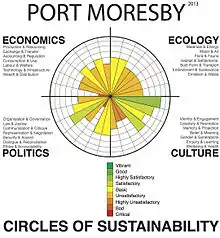 Al Jazeera describes Port Moresby as "one of the most dangerous cities in the world".[24] ABC Australia reports that "many homes have big fences covered in metal sheeting, locked gates and internal steel security doors."[25] Travel by foot is not recommended in and about the city and suburbs due to continuing breakdown in law and order. The UN Global Compact Cities Programme, using a method called Circles of Sustainability, has assessed the urban security of Port Moresby as 'critical'.[26]