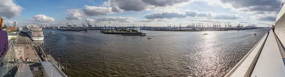 Panoramic view of the Port of Hamburg as seen from atop Dockland Hamburg