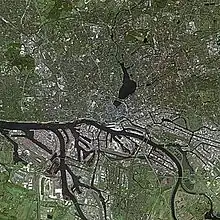 Satellite image of Hamburg. The Port of Hamburg stretches along the Southern shore of the River Elbe which branches into numerous natural river arms.