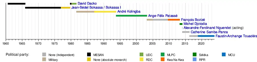 1981 | 21 September 1979[E] | 1 September 1981[13] | 1 year, 345 days | MESAN | This was Dacko's second time as president of the Central African Republic. In February 1980, Dacko established the Central African Democratic Union (UDC) as the country's only political party.[14] | |