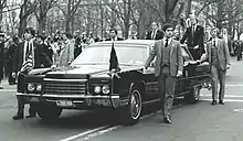 The car was used by Presidents Nixon, Ford, Carter, Ronald Reagan, and George H. W. Bush.[20] It was the vehicle in which Ford was shot at by Sara Jane Moore.[9] During the March 1981 attempted assassination of Ronald Reagan, the car was hit by the last two (of six) gunshots: the penultimate damaged the bulletproof window of the right rear passenger's door, while the last ricocheted off the back-right quarter panel and struck the president. The car then transported Reagan to George Washington University Hospital.[21] After the 1981 shooting, the car was returned to Ford to receive a new interior,[22] front sheet metal, and 1979 Lincoln grille.[20]