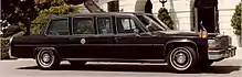 The next presidential state car was a 1983 Cadillac that was delivered on January 30, 1984.[9] This Cadillac Fleetwood is 17 inches (430 mm) longer and 3 inches (76 mm) taller than the stock Fleetwood. It featured armor and bulletproof glass (2+3⁄8 inches [60 mm] thick),[12] and was described as "distinctively styled, with a raised roof and a large rear greenhouse." To deal with the added weight of the armor, the car had oversized wheels and tires, heavy-duty brakes, and an automatic leveling system.[9]